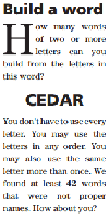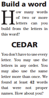 | Build a word: The objective of this activity is to create as many words as possible using only the letters found in a single sample word. The letters of the word may be used in any order, and the same letter may be used more than once. Pedagogically, this activity encourages vocabulary expansion, dictionary use and word mastery. | |