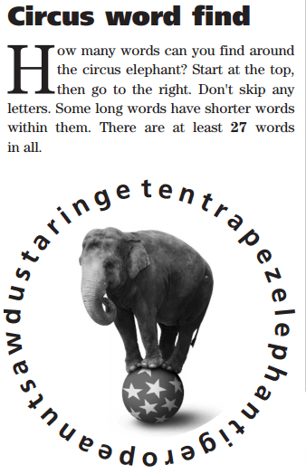 | Circular word find: In this activity, words are arranged in an uninterrupted circle. The student starts at the top and proceeds to the right, discovering as many words as possible without skipping any letters. Some long words have shorter words within them. The goal is to find as many words as possible. This game promotes word recognition, spelling awareness and vocabulary building. | |