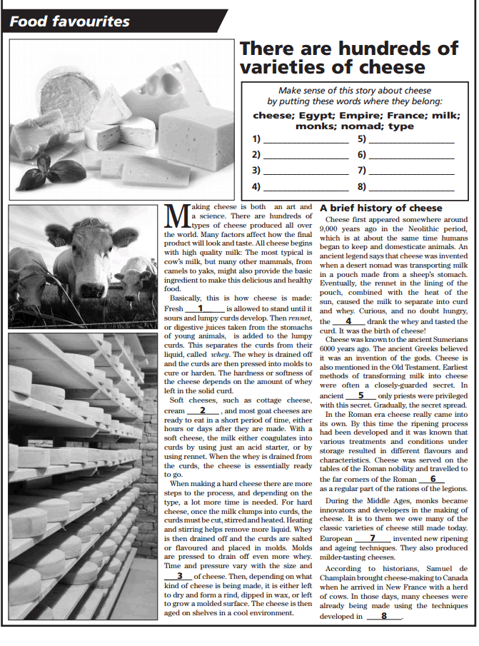 | Cloze exercise: Every month, a standard “fill in the blanks” cloze exercise appears on page four. The story is usually about a public figure, an artist, or a celebrity. Several words are omitted from the text and placed in a list at the top of the page. The reader must choose the appropriate words from this list and place them correctly within the context of the story. Cloze exercises develop a student’s ability to determine context, establish meaning and improve vocabulary. | |