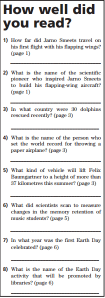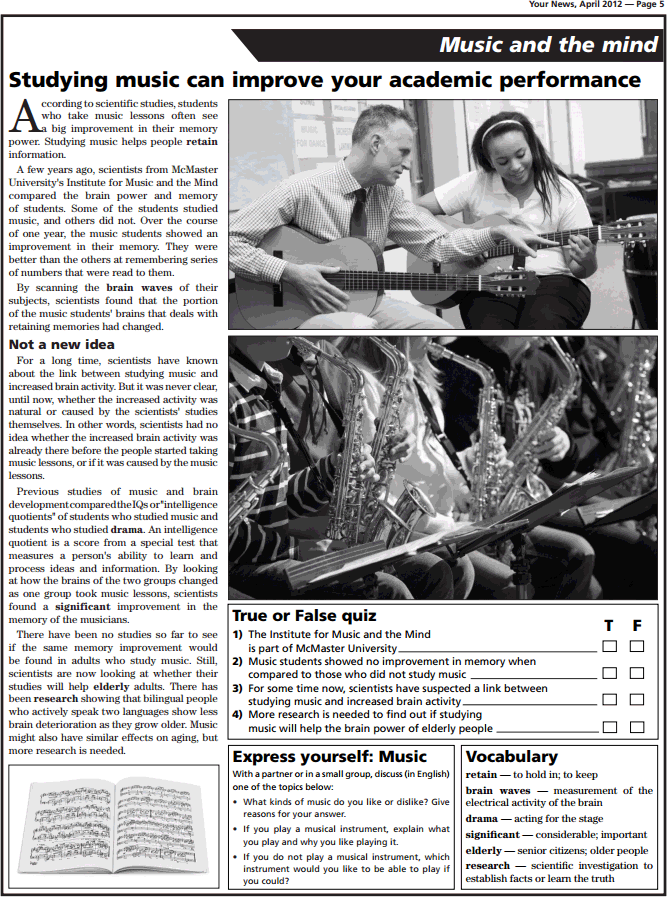 | Reading comprehension quiz: True/False quizzes accompany articles devoted to subjects from the arts, sciences, or humanities usually featured on page five. After carefully reading the article, the student must decide whether a statement about a specific point in the article is true or false. Quizzes of this type test the reader’s comprehension of the text and encourage a careful review of the content. | |