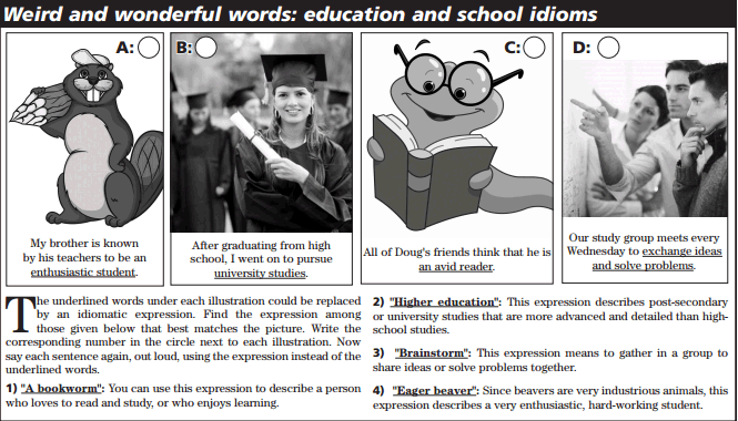 | Idioms: Each issue of Your News includes featured idioms on a selected theme. There is a visual dimension to this exercise which introduces language learners to the often puzzling expressions that are a part of everyday English. In this activity, students are invited to replace standard descriptions under the pictures with given idiomatic expressions that match the meaning. | |