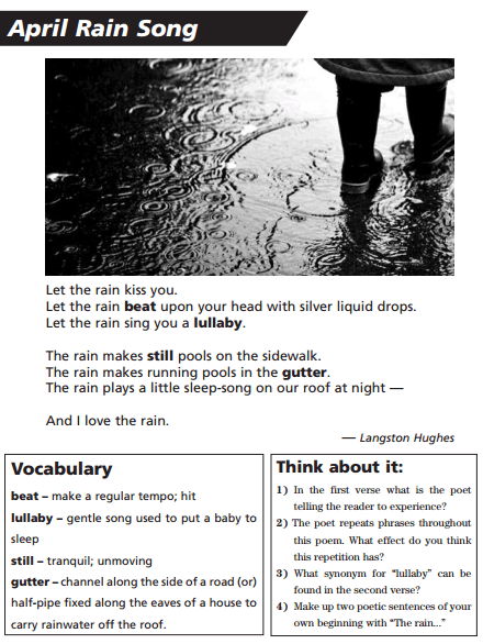 | Poetry page: Every issue of Your News includes a poetry page with vocabulary and accompanying questions. Poetry, in particular rhyming poetry, affords students the opportunity to correctly pronounce unfamiliar words and to understand their syllabication through the poem’s cadence and metrical structure. The simple poems provided in each issue promote reading comprehension, language acquisition, and the opportunity for collaborative classroom work. | |